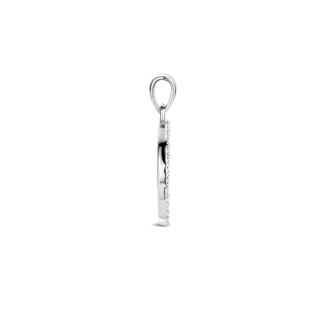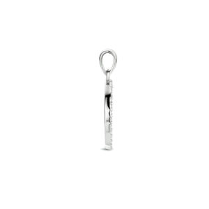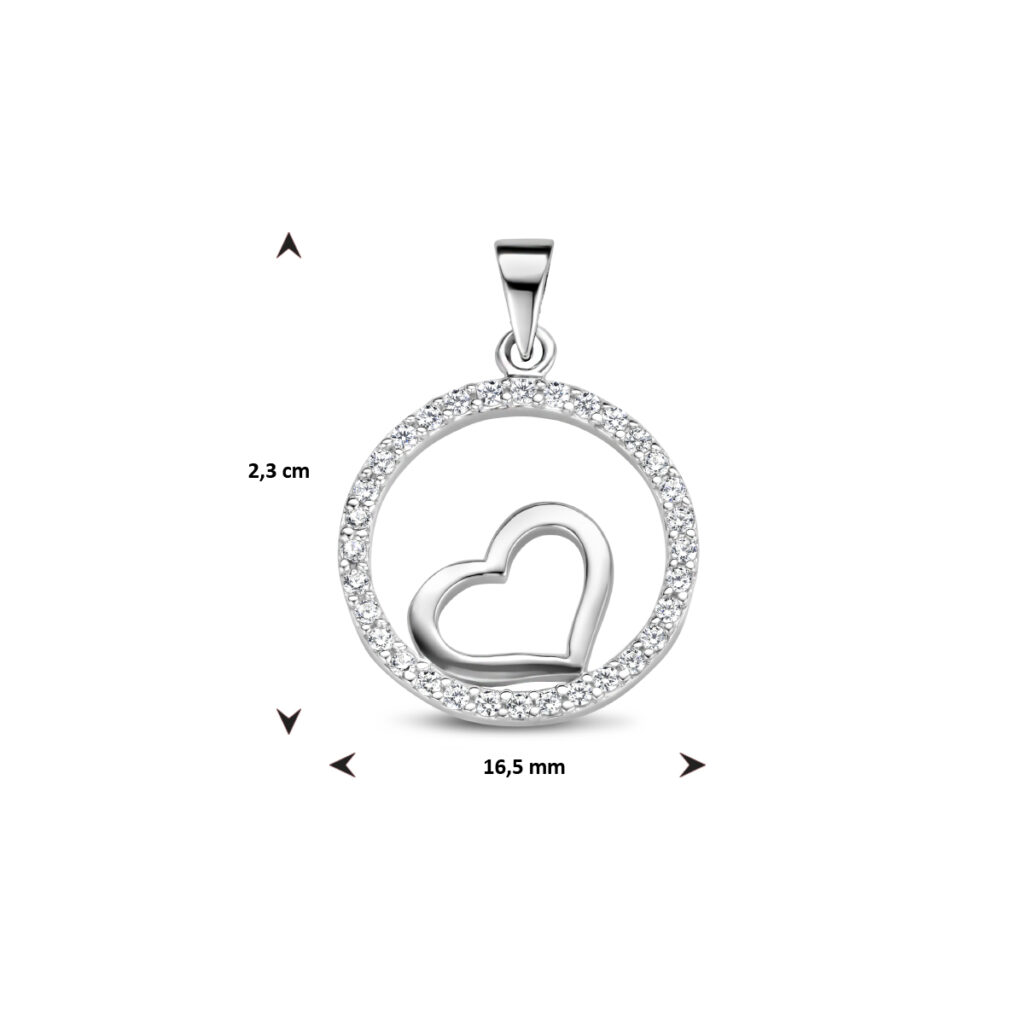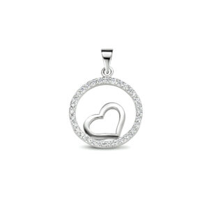 Deze prachtige hanger is volledig gemaakt van 925 sterling zilver, de allerbeste kwaliteit zilver, met een fijntjes gepolijst oppervlak dat mooi glanst en een laagje rhodium, wat ervoor zorgt dat de glans extra lang behouden blijft. Het sieraad bestaat uit een slank oogje, waar u gemakkelijk een ketting doorheen haalt, met hieronder een prachtige ronde hanger. Deze ronde hanger is open vanbinnen, maar heeft een mooie glinsterende rand dankzij de rij met zirkonia’s. Aan de binnenkant bevindt zich ook nog een opengewerkt hartje. Deze hanger heeft een diameter van 16,5 mm en wordt zonder bijpassende ketting geleverd.
