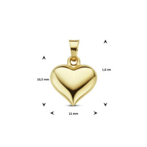 14k Geelgouden hanger uitgevoerd in de vorm van een hartje. De hanger heeft een totale hoogte van 1.6cm en een breedte van 11mm.