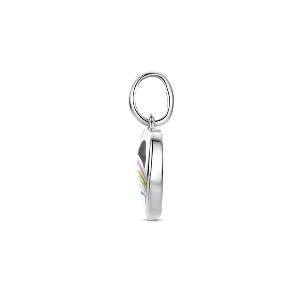 Gerhodineerd 925 zilveren hanger uitgevoerd in de vorm van een hartje met roze, geel, groen en blauw emaille. De hanger heeft een totale hoogte van 14mm