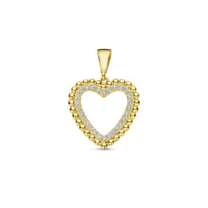 14k Geelgouden hanger uitgevoerd met een hart en zirkonia. De hanger heeft een totale hoogte van 21.5mm.