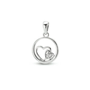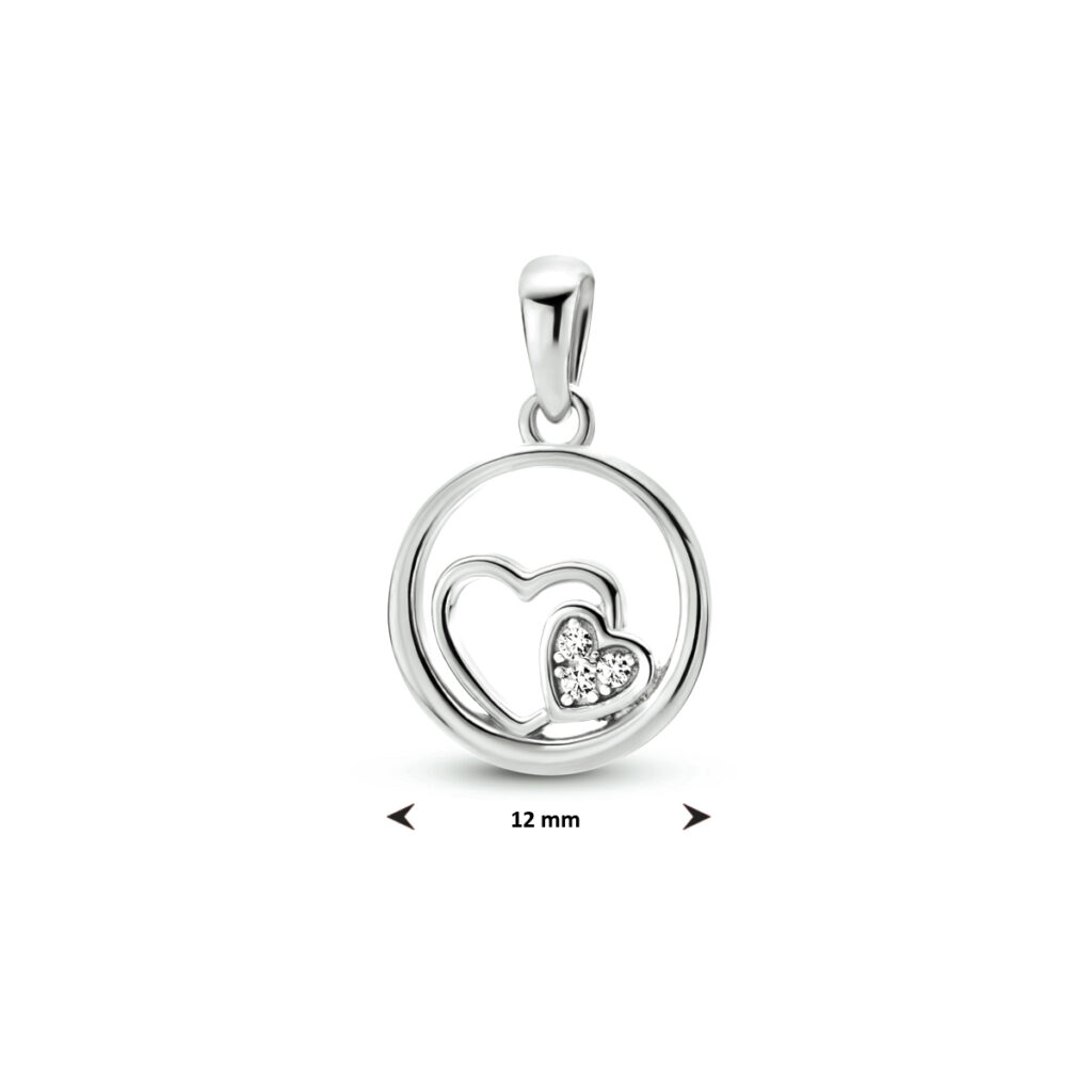 Gerhodineerd 925 zilveren hanger uitgevoerd met twee hartjes en een schitterend zirkonia vlak. De hanger heeft een totale hoogte van 1.8cm en een diameter van 12mm.
