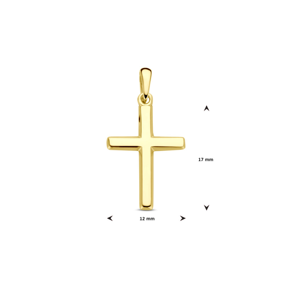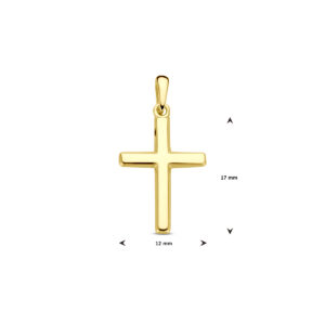 14k Geelgouden hanger uitgevoerd in de vorm van een kruis. De hanger heeft een totale hoogte van 23mm. Het kruis heeft een afmeting van 17x12mm.