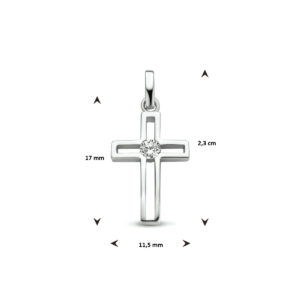 Gerhodineerd 925 zilveren hanger uitgevoerd in de vorm van een kruis met daarin een schitterende zirkonia. De hanger heeft een totale hoogte van 2.3cm en een breedte van 11.5mm.