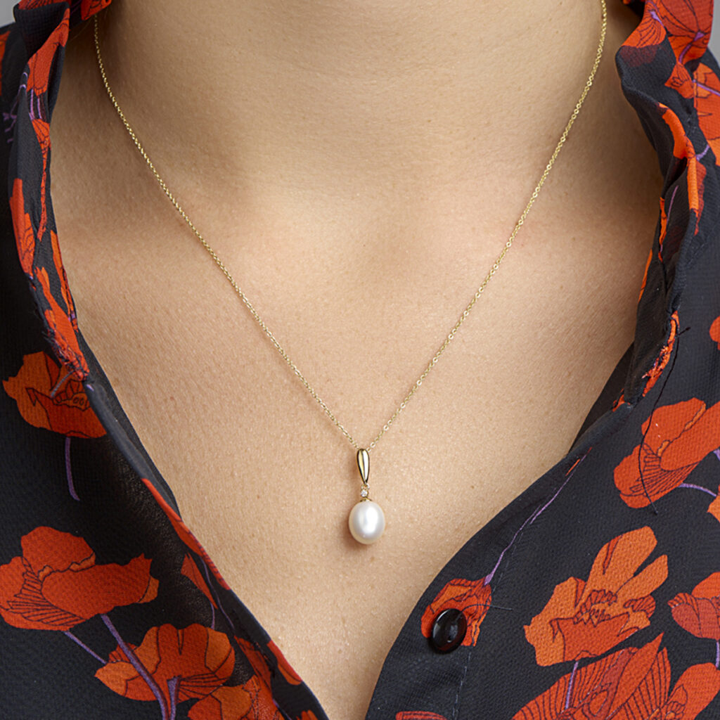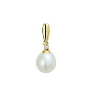 Geelgouden hanger met zoetwaterparel en zirkonia. De hanger is onderdeel van een set.