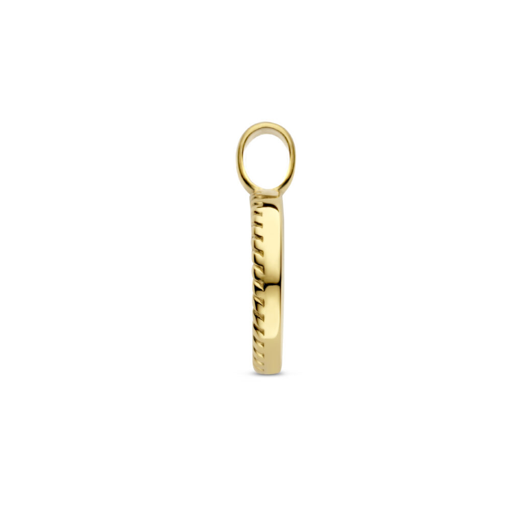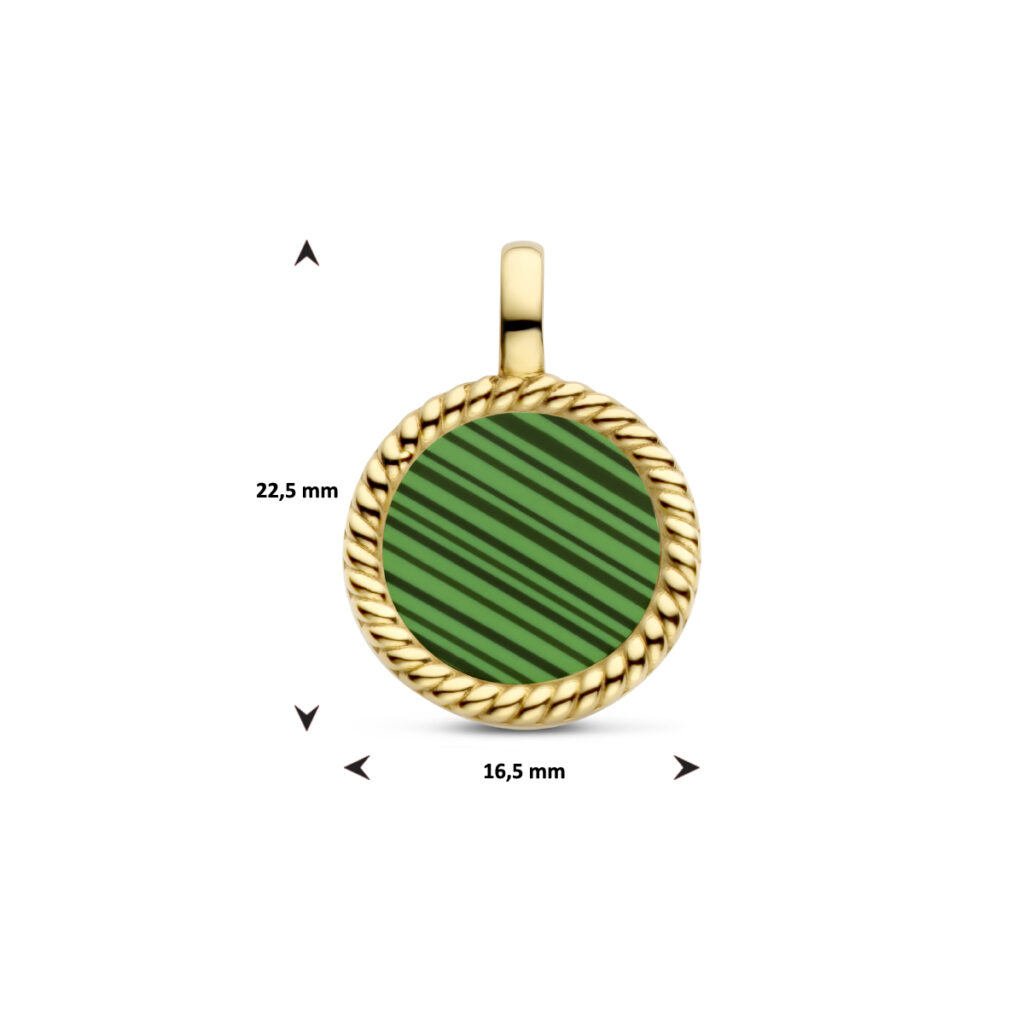 Stalen hanger met goudkleurige ion plating uitgevoerd met synthetisch malachiet. De hanger heeft een diameter van 16.5mm.