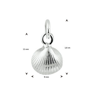 925 zilveren hanger uitgevoerd in de vorm van een schelp. De hanger heeft een totale hoogte van 1.6cm en een breedte van 8mm.