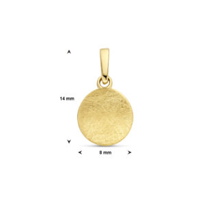Deze prachtige Gouden Scratch Ronde Hanger is vervaardigd uit gepolijst 14 karaat geelgoud, loopt enigszins hol en heeft een metaalgewicht van circa 0,43 gram. De hanger worden bevestigd met behulp van een bevestigingsoog en heeft een diameter van 8 mm, met een totale hangerhoogte van 14 mm.