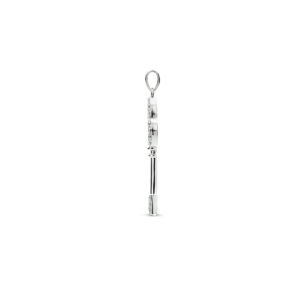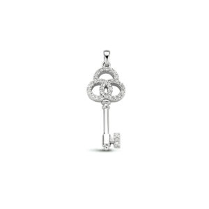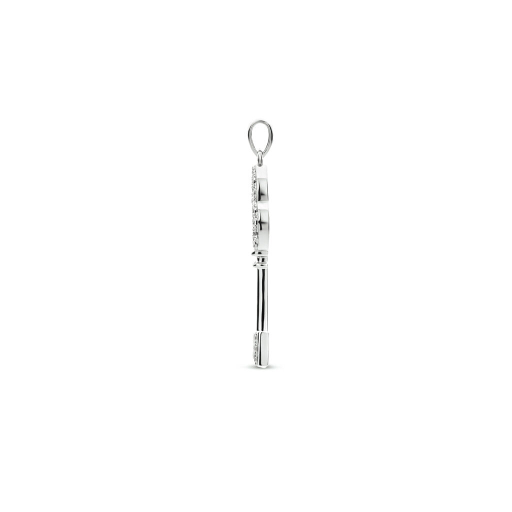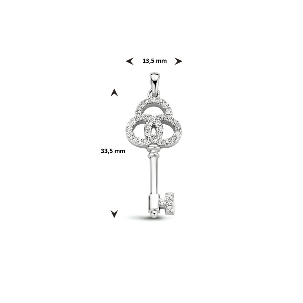 Gerhodineerd 925 zilveren hanger uitgevoerd in de vorm van een sleutel en met schitterend zirkonia. De hanger heeft een totale hoogte van 3.8cm en een breedte van 13.5mm.