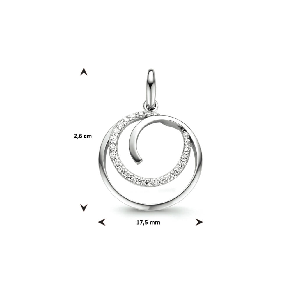 Deze hanger is gemaakt van 925 sterling zilver, de allerbeste kwaliteit zilver. Het sieraad is gepolijst en voorzien van een laagje rhodium, wat ervoor zorgt dat de glans extra lang behouden blijft. De hanger is voorzien van een slank oogje, waar u gemakkelijk een ketting doorheen haalt, met daaronder twee een opengewerkte rondjes die mooi in elkaar overlopen. Het middelste rondje bestaat uit een rij met schitterende zirkonia steentjes. De hanger heeft een totale hoogte van 2,6 cm en een breedte van 8,3 mm.