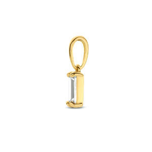 14k Geelgoud hanger uitgevoerd met een zirkonia. De hanger heeft een totale hoogte van 1.2cm en een afmeting van 10x5mm.