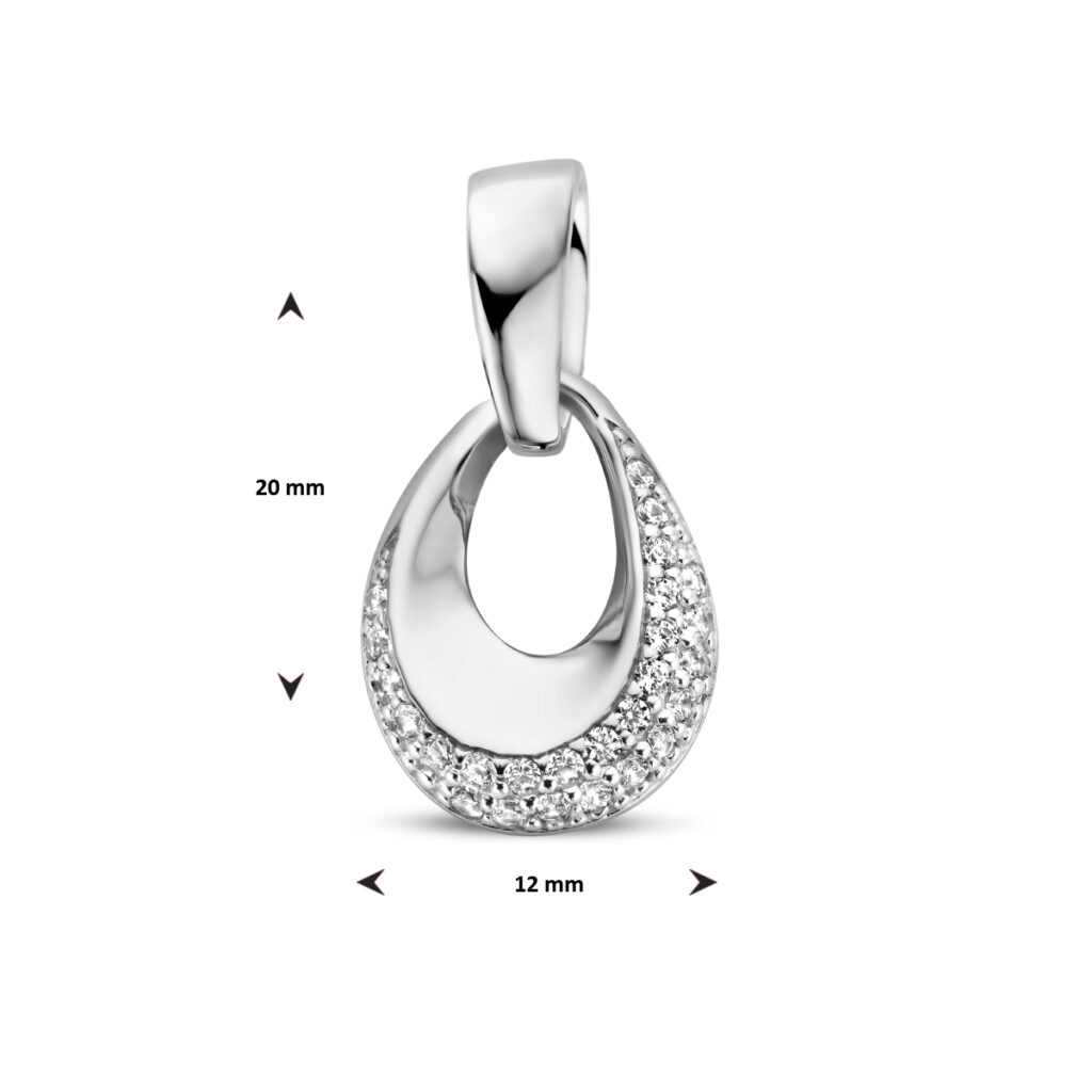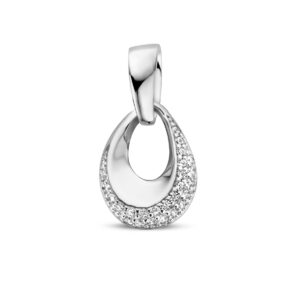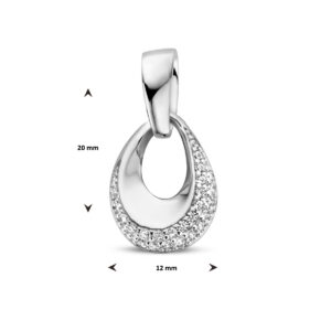 Sprankelende Zilveren Druppelvormige Zirkonia Hanger die is vervaardigd uit 925 Sterling zilver dat is voorzien van een gerhodineerde beschermlaag, waarbij de druppelvormige hanger een afmeting heeft van 20 x 12 mm. De druppelvormige hanger is voorzien van in Pave zetting geplaatste transparante, briljant geslepen zirkonia’s. Deze druppelvormige hanger vormt samen met de Zilveren Druppelvormige Zirkonia Oorstekers 13.35700 een schitterende sieradenset.