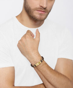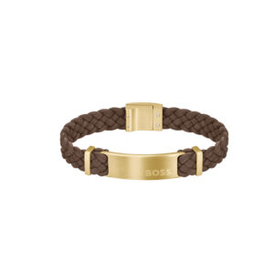 Deze leren armband voor heren van BOSS uit de DYLAN serie met artikelnr. HBJ1580607M is een stoer sieraad voor de echte BOSS klant. De bruine suede gevlochten armband heeft een goudkleurige plaat in het midden met daarop het BOSS logo gegraveerd, die mooi opvalt in het geheel. De leren armband heeft een lengte van 19cm, sluit met een magneetsluiting en is goed te combineren met andere sieraden van BOSS.