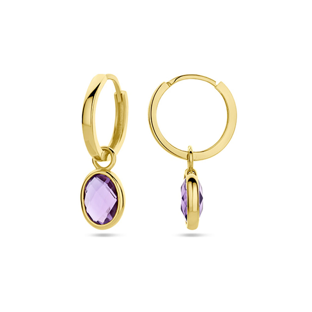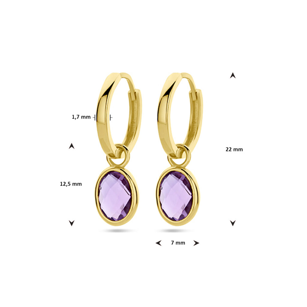 14k Geelgouden klapoorringen uitgevoerd met amethist. De oorringen hebben een totale hoogte van 22mm.