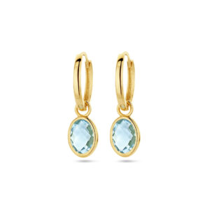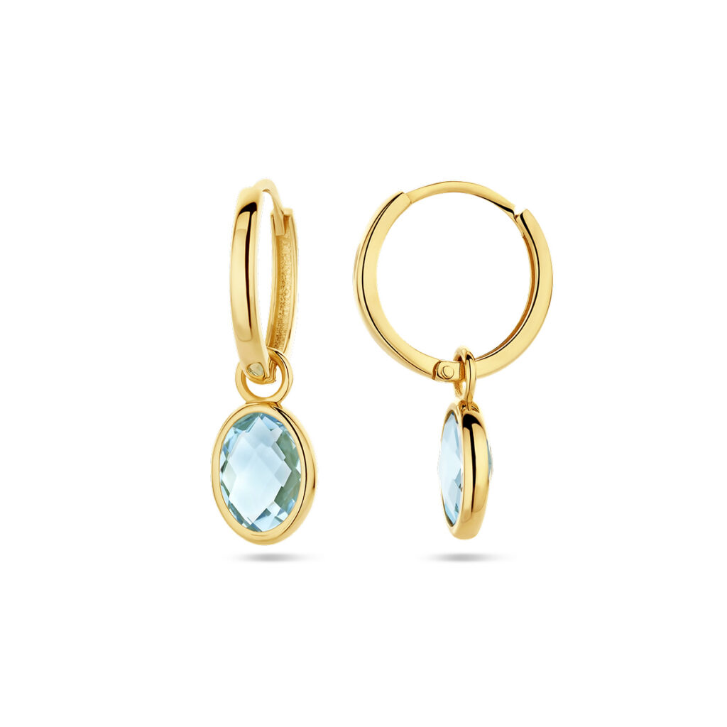 14k Geelgouden klapoorringen uitgevoerd met blauw topaas. De oorringen hebben een totale hoogte van 22mm.