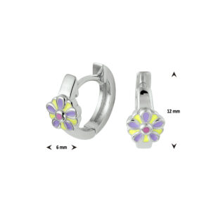 Schattige gerhodineerd zilveren oorringen met scharnier uitgevoerd met een bloem in paars, geel en roze emaille.