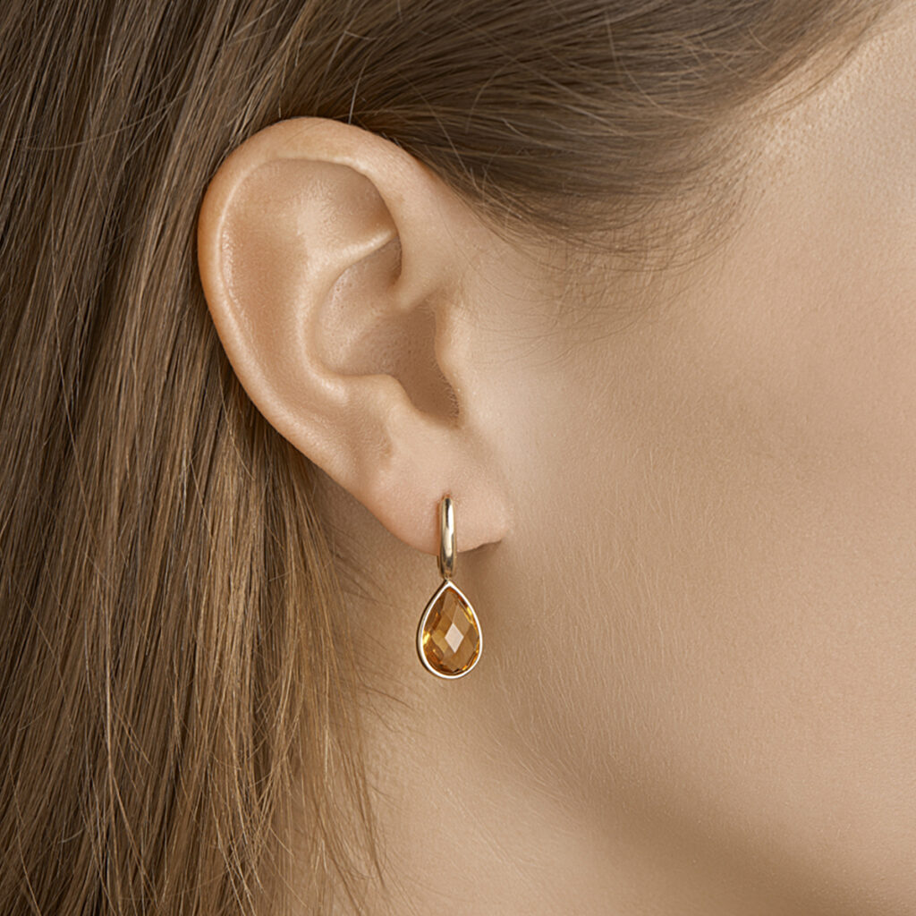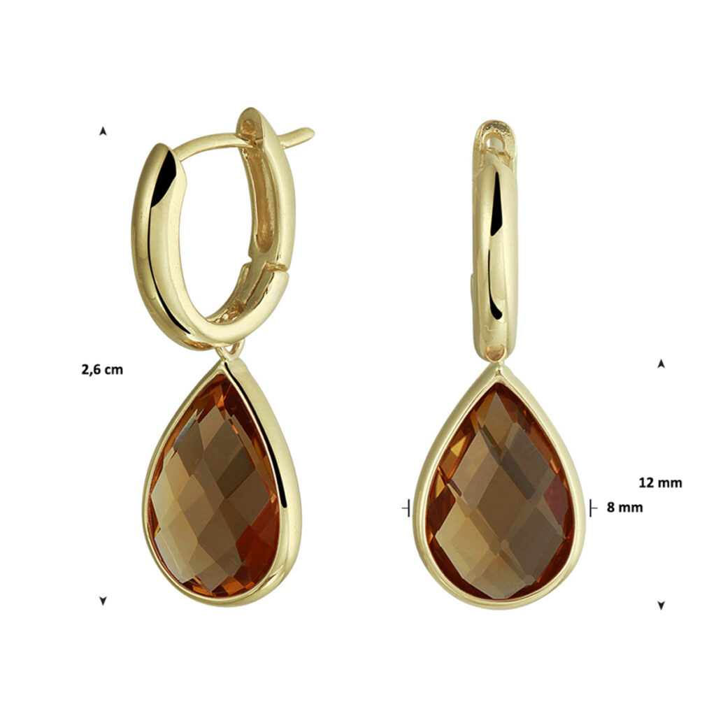 Deze oorhangers zijn gemaakt van 14 karaats geelgoud, de allerbeste kwaliteit geelgoud, met een fijntjes gepolijst oppervlak dat mooi glanst. Deze oorhangers bestaan uit een slanke, bolstaande creool met een handige scharniersluiting waardoor u de oorhangers gemakkelijk in- en uitdoet, met daaronder een druppelvormige hanger die aan de voorkant voorzien is van een facetgeslepen Citrien edelsteen die mooi glanst. Deze oorhangers hebben een afmeting van 26mm met een steenmaat van 8x12mm.