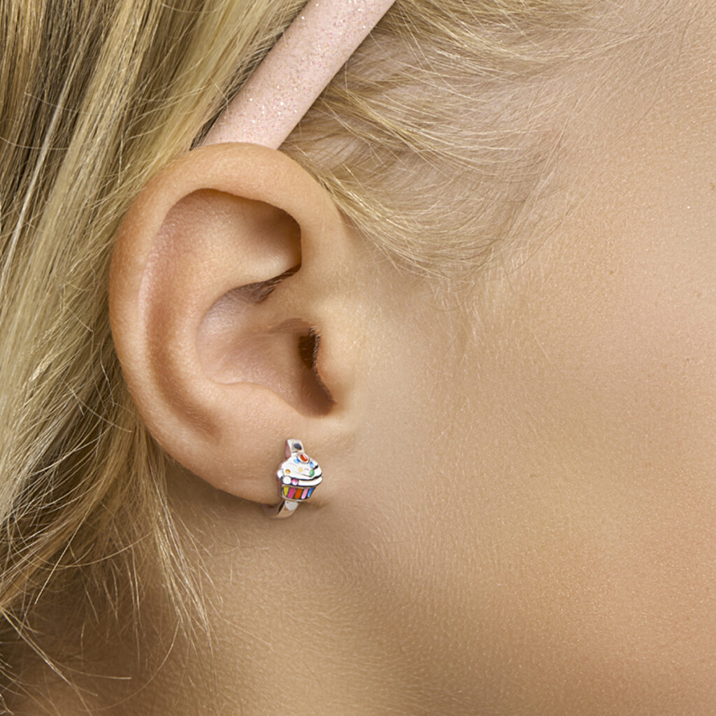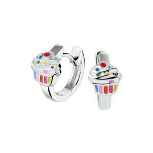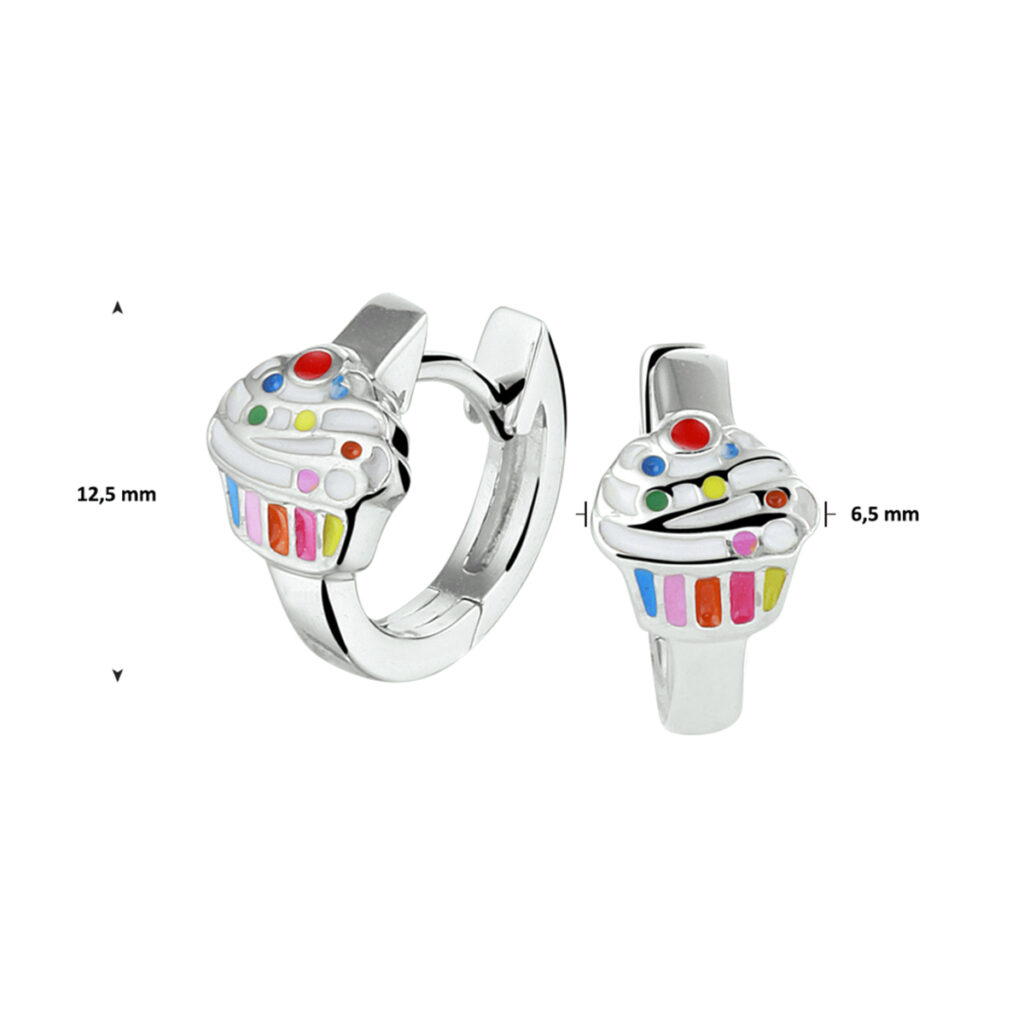 Schattige gerhodineerd zilveren oorringen met scharnier uitgevoerd met een cupcake in verschillende kleuren emaille. De oorringen hebben een diameter van 12.5mm.