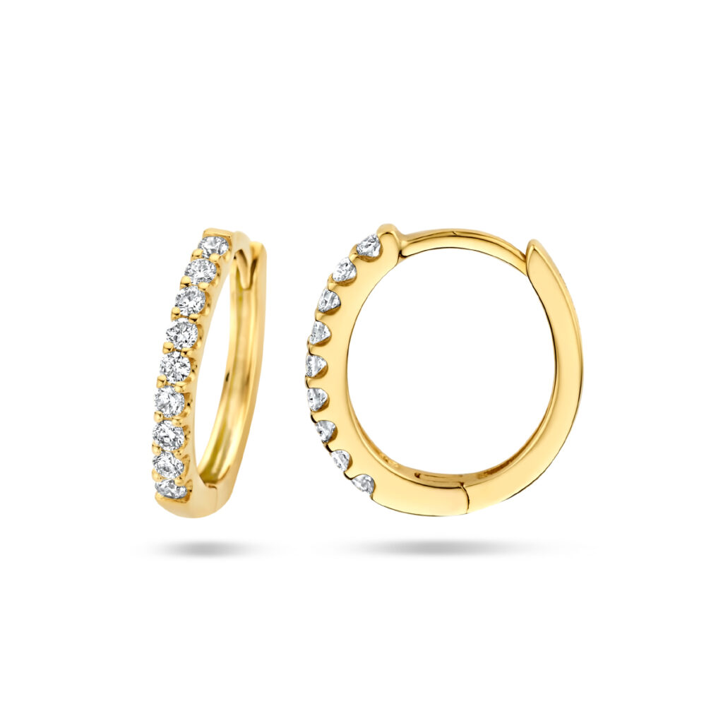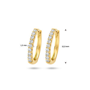 14k Geelgouden klapoorringen met een stevig scharnier uitgevoerd met een schitterende diamant rij. De oorringen hebben een afmeting van 12.5×1.5mm.