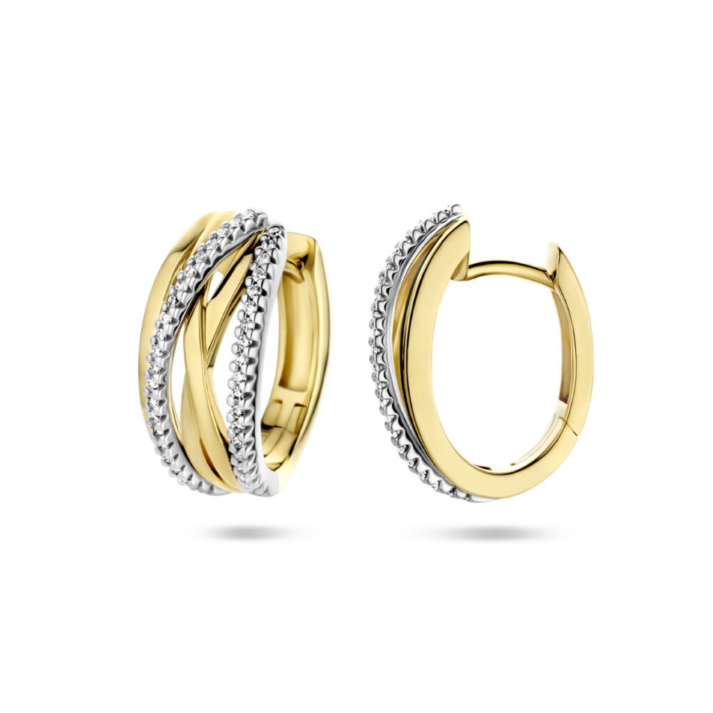 14k Bicolor geel- en witgouden klapoorringen met scharnier uitgevoerd met schitterende diamanten. De oorringen hebben een afmeting van 17.5x8mm.