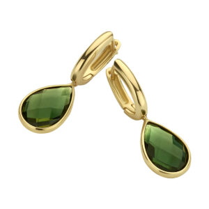 14k Geelgouden oorringen met scharnier uitgevoerd met schitterende groen kwarts. De oorringen hebben een totale hoogte van 26mm.