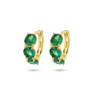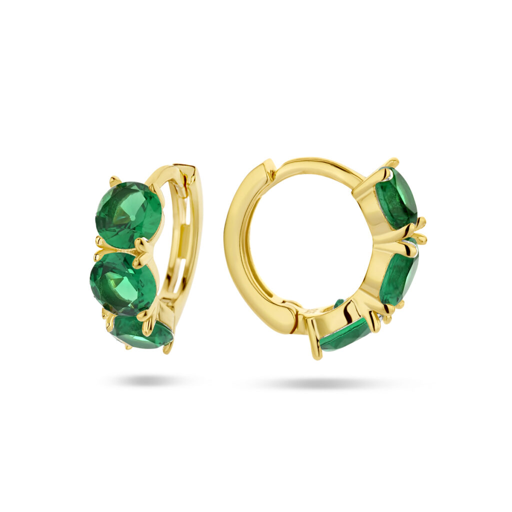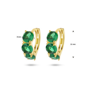 Geelgoud op 925 zilveren klapoorringen uitgevoerd met groen zirkonia. De klapoorringen hebben een afmeting van 11x4mm. Geen garantie op de plating.