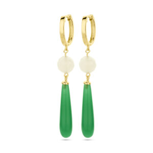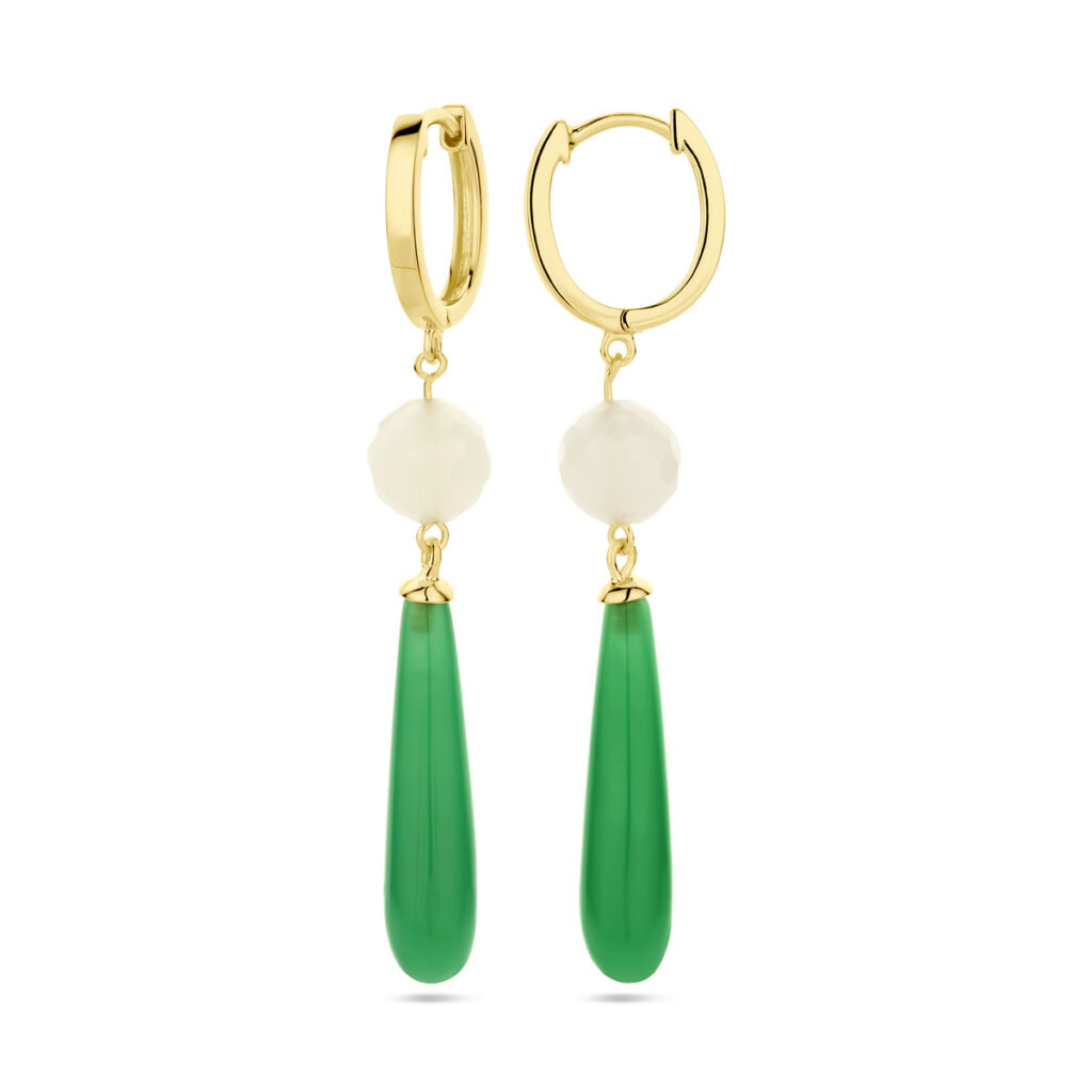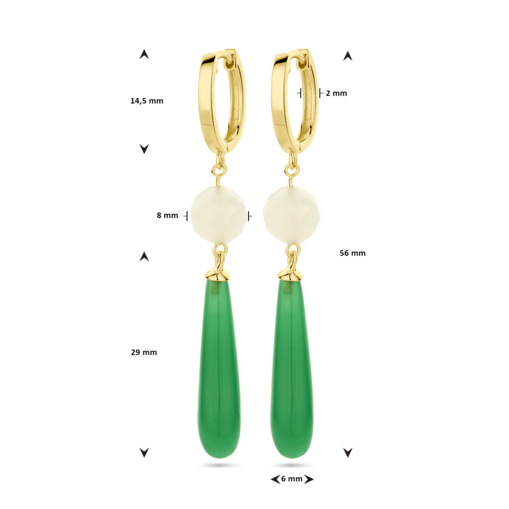 Geelgoud op 925 zilveren klapoorringen met een totale hoogte van 56mm. De oorringen zijn uitgevoerd met wit en groen glasstenen.