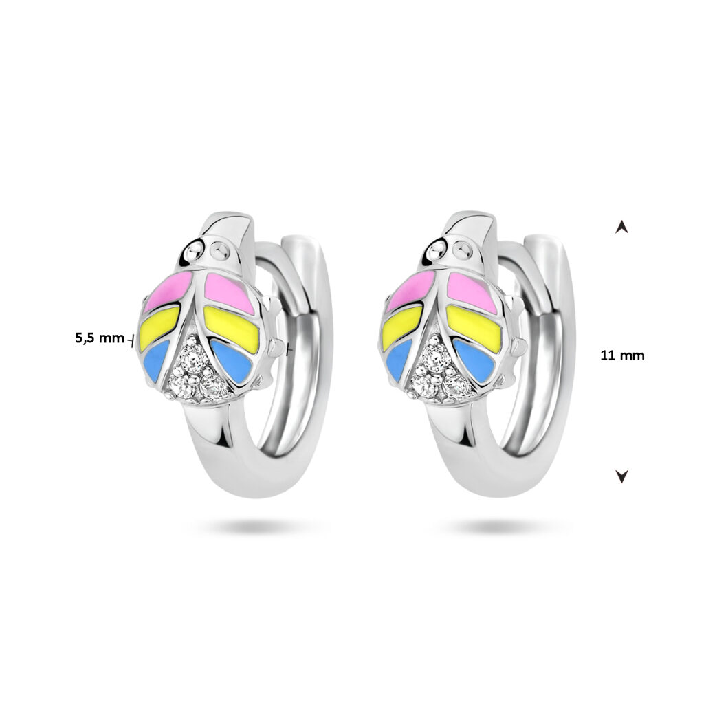 Gerhodineerd 925 zilveren oorringen uitgevoerd met een lieveheersbeestje en zirkonia. De oorringen hebben een diameter van 11mm.