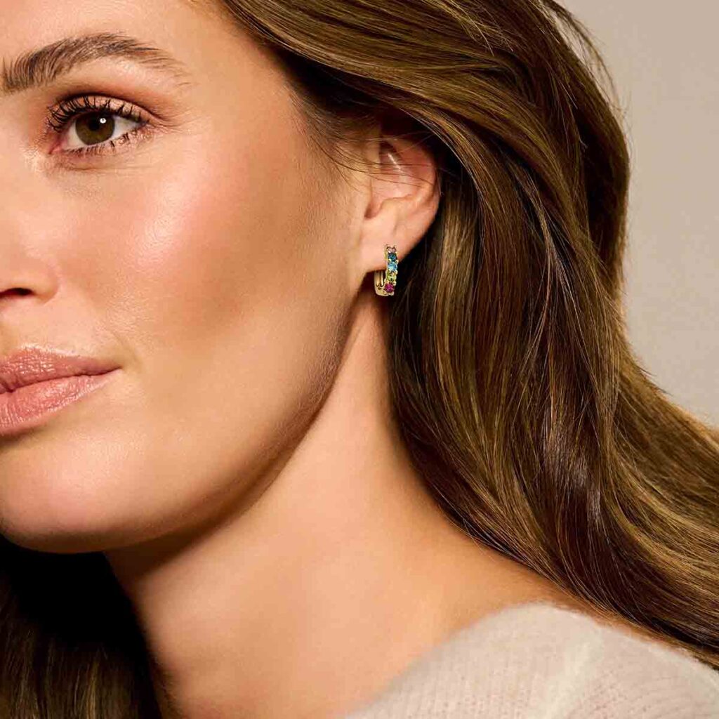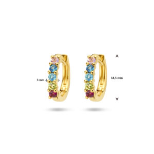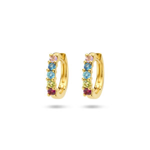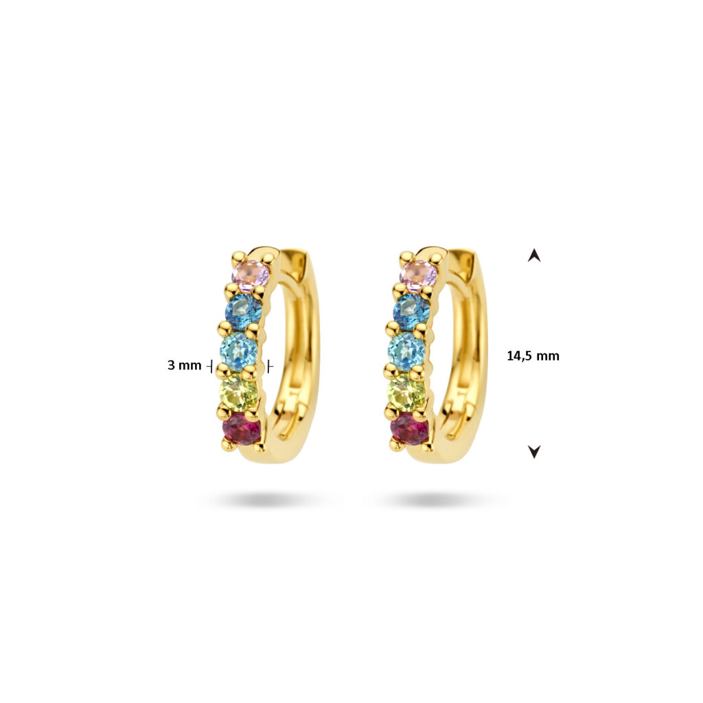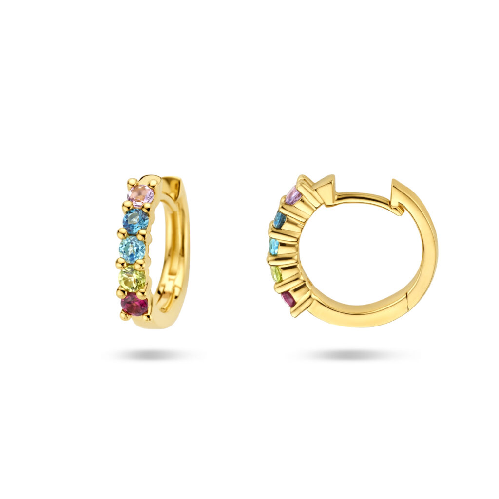 14k Geelgouden klapoorringen met een diameter van 14.5mm en verschillende edelstenen zoals: peridot, blauw topaas, London blue topaas, amethist en roze rhodoliet.