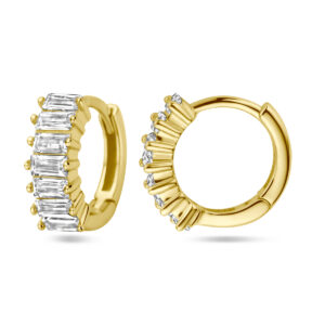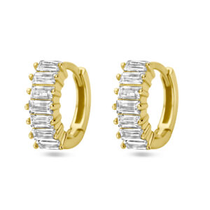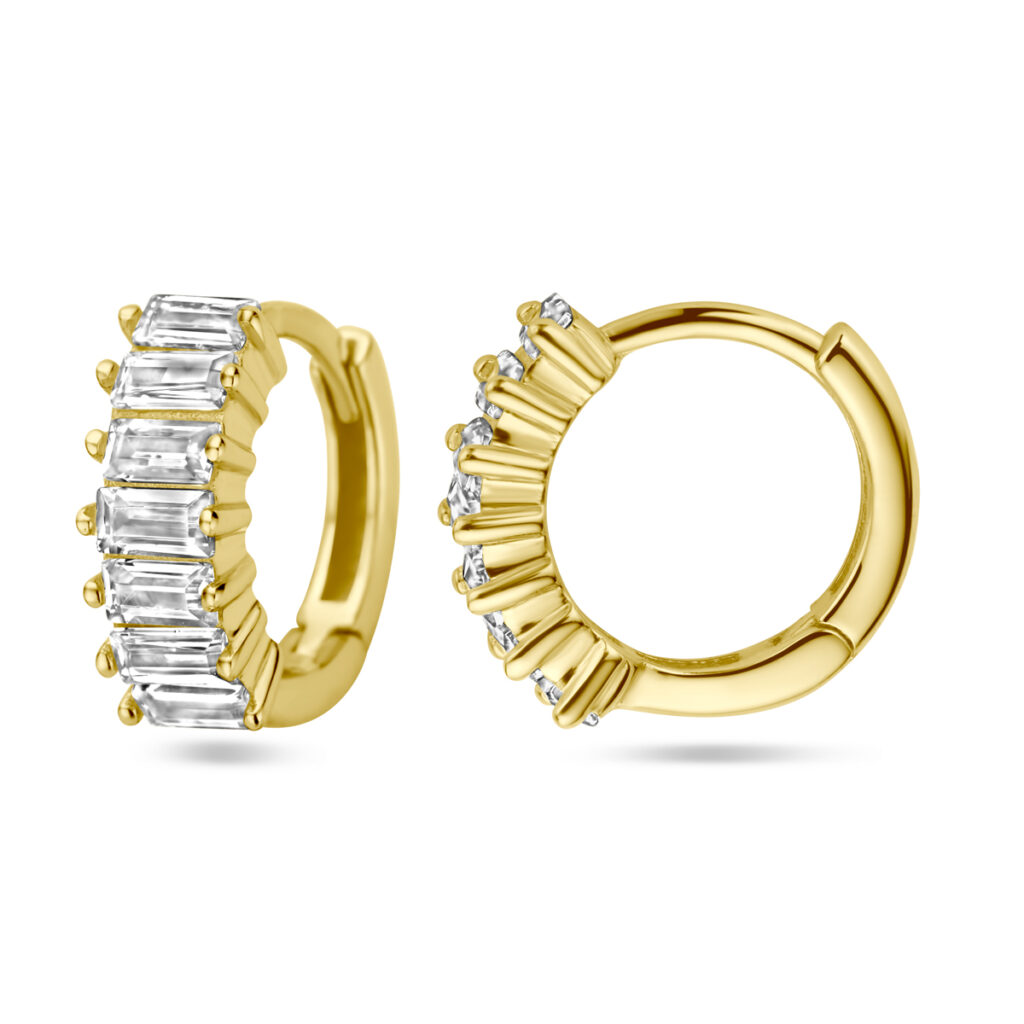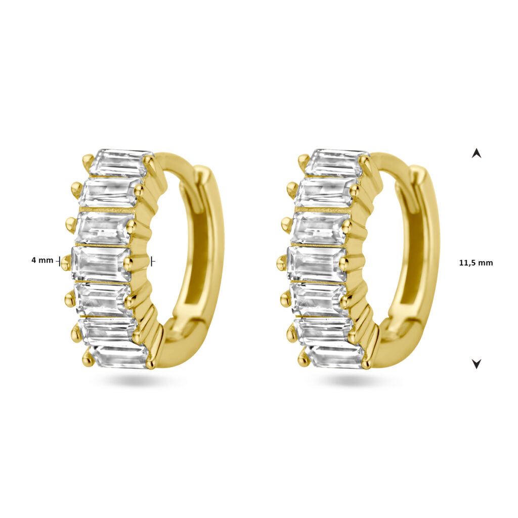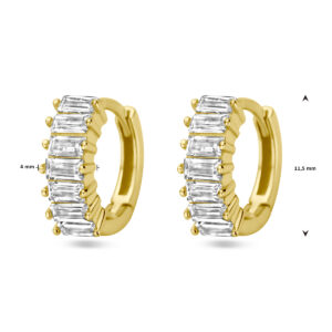 Deze luxueuze Goudkleurige Klapoorringen met Rechthoekige Zirkonia’s 11,5 x 4 mm zijn vervaardigd uit 925 Sterling zilver, dat is voorzien van een goudkleurige coating van 1 micron. De oorringen bevatten aan de voorkant in de breedte in rijzetting geplaatste, baguette geslepen, transparante, rechthoekige Zirkonia stenen. De klapoorringen hebben een breedte van 4 mm bij een doorsnee van 11,5 mm en een metaalgewicht van circa 1,5 gram.