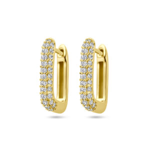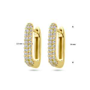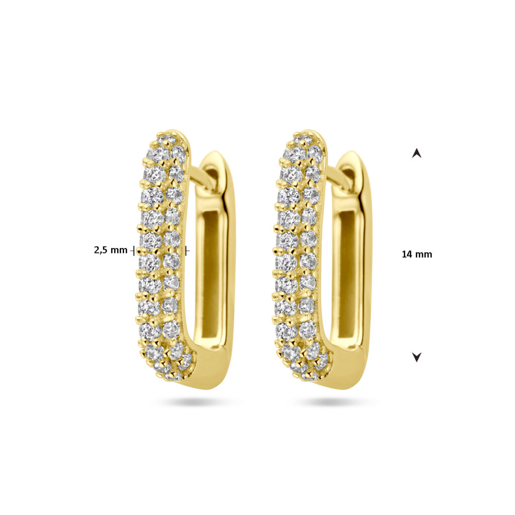 Geelgoud op 925 zilveren klapoorringen uitgevoerd met zirkonia. De klapoorringen hebben een afmeting van 14×2.5mm. Geen garantie op de plating.