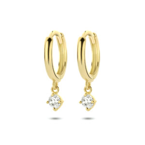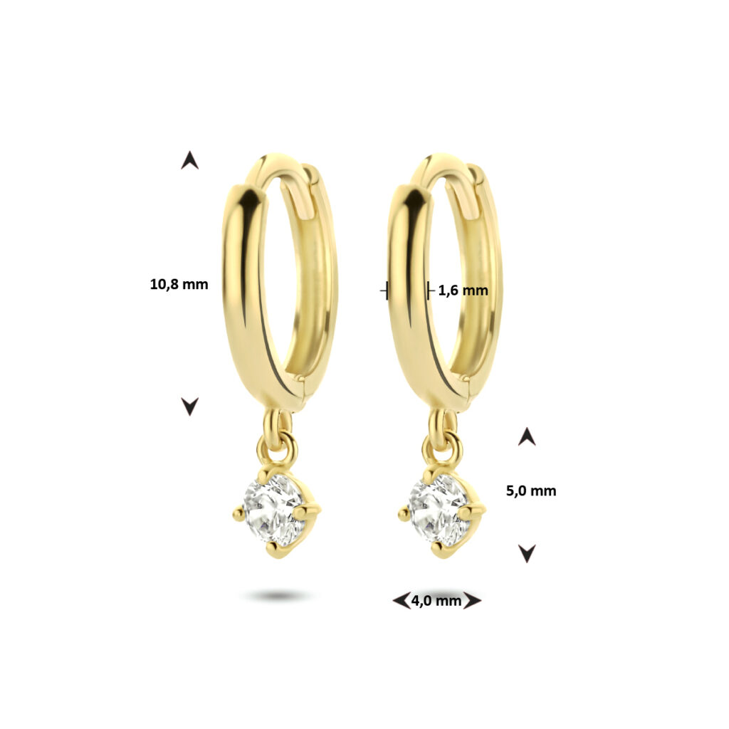 14k Geelgouden klapoorringen uitgevoerd met een schitterende zirkonia. De oorringen hebben een diameter van 10.8mm.