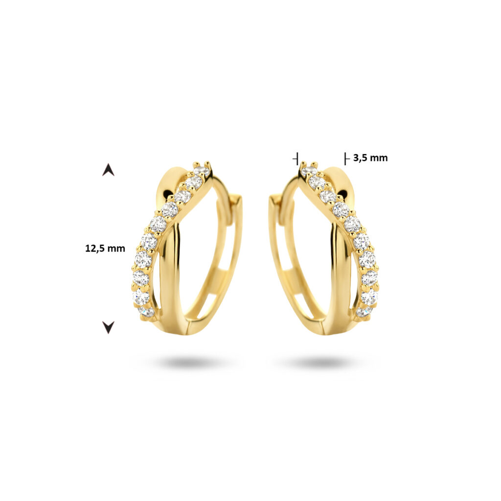 Deze Slanke Klapcreolen van Geelgoud met Golvende Zirkonia Strook zijn volledig gemaakt van 14 karaats geelgoud, de allerbeste kwaliteit geelgoud, met een gepolijst oppervlak en meerdere kleurloze zirkonia’s. Deze klapcreolen hebben een breedte van 3,5mm met een diameter van 12,5mm. Dit sieraad bestaat uit een slanke strook geelgoud met aan de voorkant een golvende strook kleurloze zirkonia’s die mooi glinsteren. Deze oorsieraden zijn geschikt voor dames en zijn bijzonder leuk als cadeau. Dit sieraad zal tevens niet misstaan op bijvoorbeeld een luxe gala of een black-tie event. Deze oorsieraden behoren tot onze huiscollectie, waardoor u verzekerd bent van de allerbeste kwaliteit tegen de scherpste prijs!