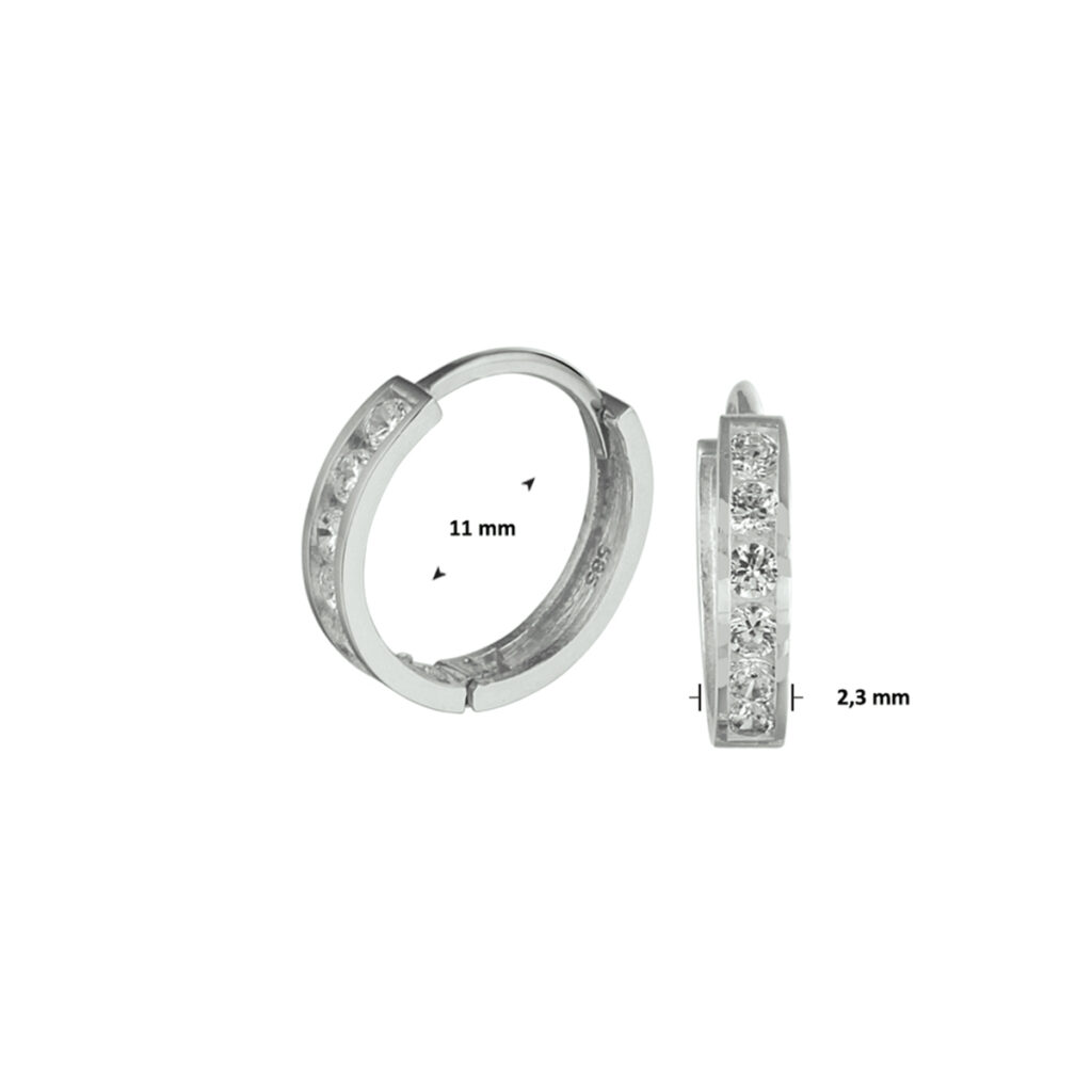 14k Witgouden oorringen met scharnier uitgevoerd met een zirkonia rij. De afmeting van de oorringen is 11×2.3mm.