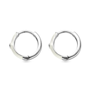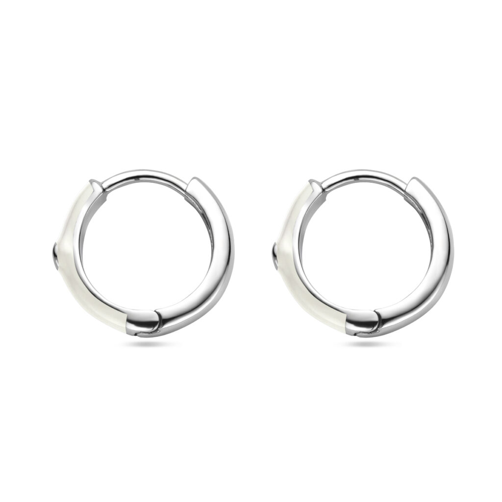 Gerhodineerd 925 zilveren klapoorringen uitgevoerd met zirkonia en wit emaille. De klapoorringen hebben een afmeting van 15×2.5mm.