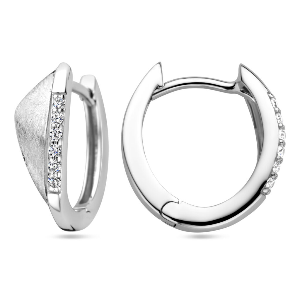 Gerhodineerd 925 zilveren klapoorringen uitgevoerd met zirkonia. De klapoorringen hebben een afmeting van 15.5×5.5mm.