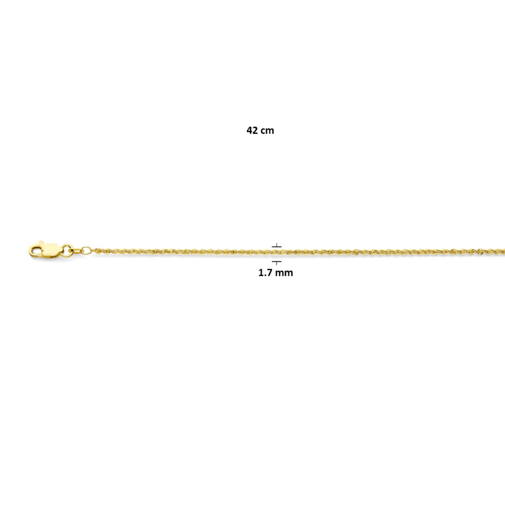 14k Geelgouden lengteartikel met een schakelbreedte van 1.7mm. Uitgevoerd met een karabijn sluiting.