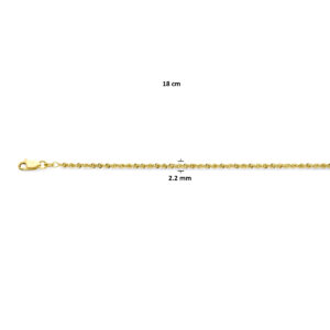 14k Geelgouden koord lengte-artikel uitgevoerd met een karabijn sluiting. De schakelbreedte is 2.2mm.
