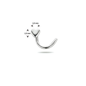 Gerhodineerd 925 zilveren neusknopje uitgevoerd in de vorm van een hartje. Het neusknopje heeft een afmeting van 2.5×2.5mm.
