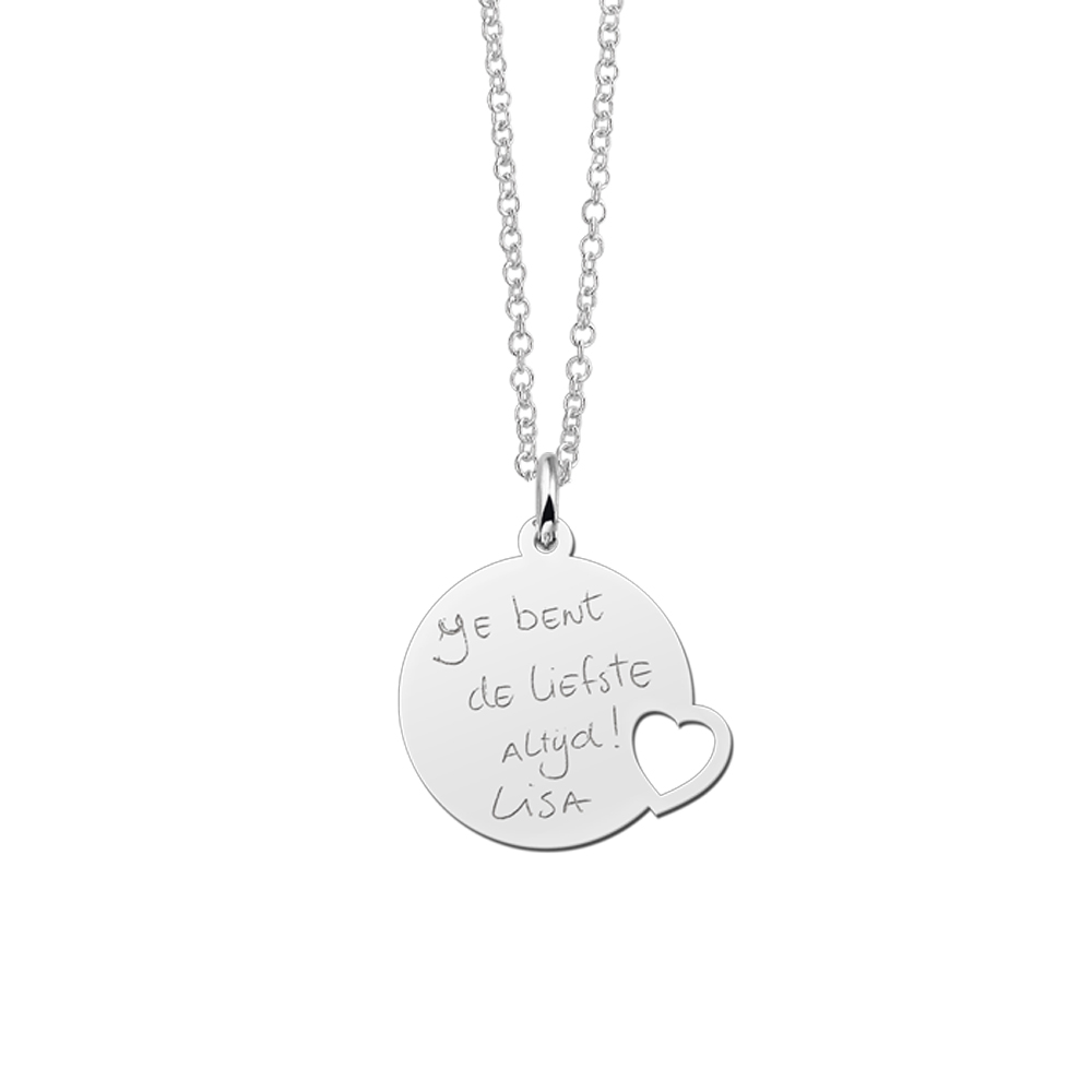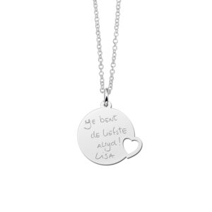 Deze Zilveren Cirkel met Hart Graveer Hanger is afkomstig van Names4ever en prachtig afgewerkt door een ervaren edelsmid. De letters op de hanger zullen per persoon verschillen omdat ieder handschrift verschilt. Hierdoor draagt u een uniek en persoonlijk sieraad, dat ook nog eens superleuk is om cadeau te doen. Bekijk en lees het stappenplan om te kijken hoe u één van deze persoonlijke sieraden kunt laten maken.