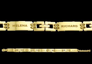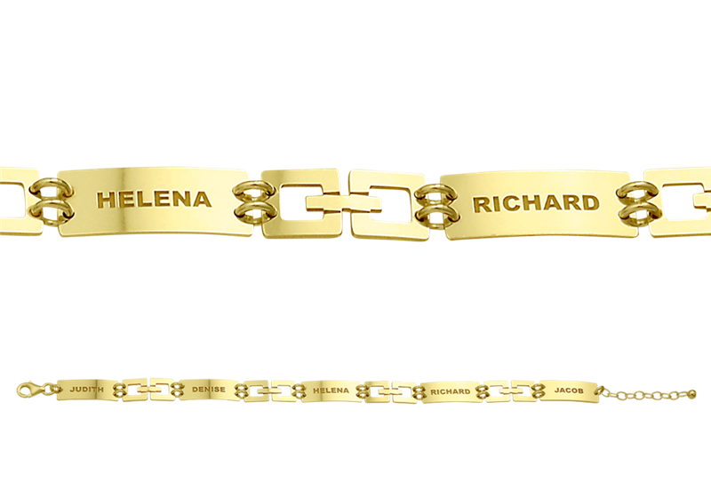 Deze gouden armband met graveerplaatjes van Names4ever is gemaakt van 14 karaats goud, de allerbeste kwaliteit goud, en bestaat uit meerdere rechthoekige plaatjes die met elkaar verbonden zijn middels twee ronde schakels. Diverse van de rechthoekige plaatjes zijn voorzien van een opengewerkt oppervlak ter decoratie. De vijf graveerplaatjes kunnen alle vijf voorzien worden van een naam naar keuze, zodat u verzekerd bent van een uniek en persoonlijk sieraad. Aan de achterkant zit een handige karabijnsluiting, waardoor u deze armband gemakkelijk om- en afdoet. De armband heeft een maximale lengte van 20cm met een minimale draaglengte van 17cm. De graveerplaatjes hebben een afmeting van 19×7,5mm met een dikte van 0,4mm.