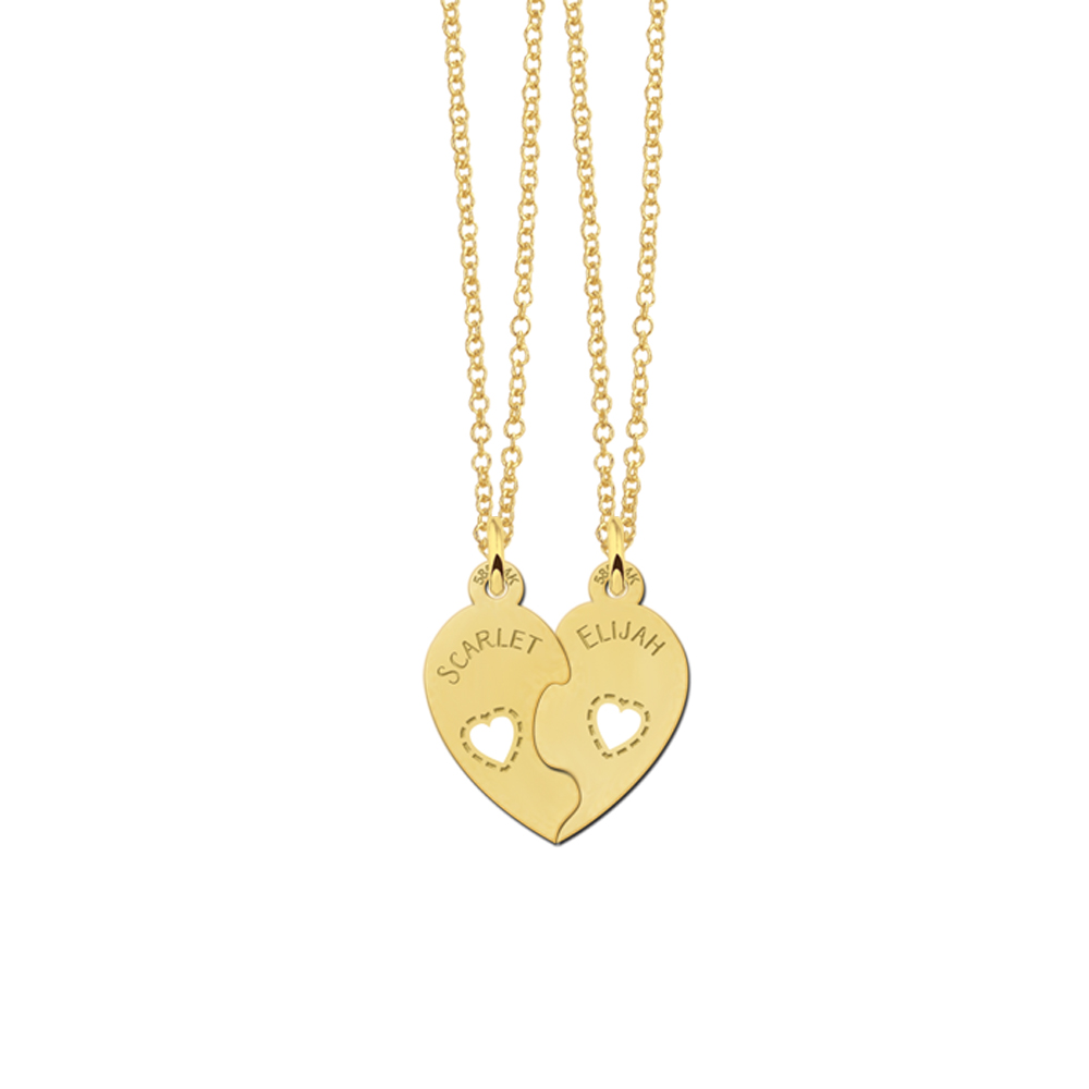 Deze gouden hartje hanger is volledig gemaakt van 14 karaats goud, de allerbeste kwaliteit goud, en voorzien van een fijntjes gepolijst oppervlak dat mooi glanst. Dit sieraad bestaat uit een hartvormige hanger die uit elkaar gehaald kan worden om twee gelijke helften te creëren, die beiden zijn voorzien van een eigen ketting. De losse hangers vormen samen een hart voor een wel heel romantisch sieraad. De twee helften zijn beiden voorzien van een opengewerkt hartje in het midden, met bovenaan ruimte voor een te graveren naam naar keuze.