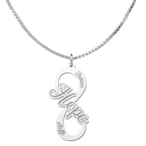 Deze Hope Infinity Hanger van Zilver is afkomstig van Names4ever, bekend om hun stijlvolle en gepersonaliseerde sieraden van absolute topkwaliteit. Zo is deze infinity hanger gemaakt van 925 sterling zilver, de allerbeste kwaliteit zilver, en heeft de hanger een afmeting van 20x38mm. Deze Hope infinity hanger ontleend haar naam aan het woord hope in het midden van het infinity teken. Boven en onder het woord hope is er ruimte voor maar liefst twee te graveren namen. Deze namen kunt u zelf doorgeven en deze zullen na bestelling speciaal voor u in de hanger geplaatst worden door een ervaren edelsmid in een professioneel atelier. Bestel ook een bijpassende zilveren ketting bij deze hanger zodat u uw sieraad meteen na ontvangst kunt dragen.