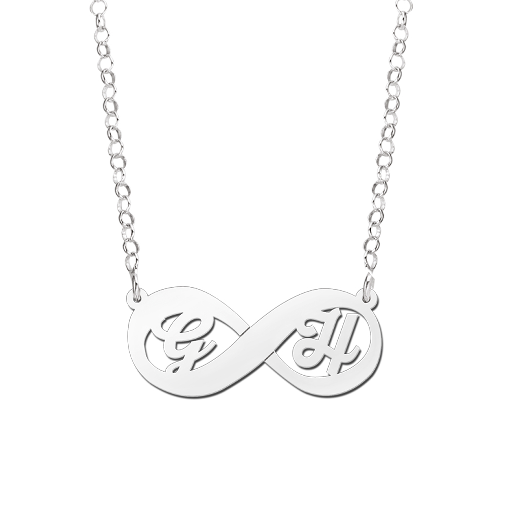 Op deze infinity initialen hanger gemaakt van 925 sterling zilver is er plek voor twee initialen die mooi en sierlijk in deze stijlvolle hanger verwerkt worden. De hanger heeft een totale grootte van 35×15 mm en wordt geleverd compleet met een mooie jasseron ketting van zilver met een lengte van 42cm.