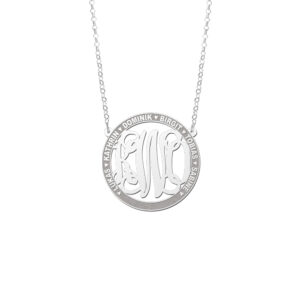 Deze monogram hanger met namen heeft een diameter van 33 mm en is gemaakt van 925 sterling zilver, waardoor het een opvallend, kwalitatief sieraad is. U kunt bij deze monogram hanger met namen maar liefst zes namen en drie monogram letters aangeven die dan in het sieraad verwerkt worden voor een werkelijk persoonlijk cadeau. Bij deze hanger krijgt u ook een stijlvolle zilveren ketting met jasseron schakel van 45 cm.