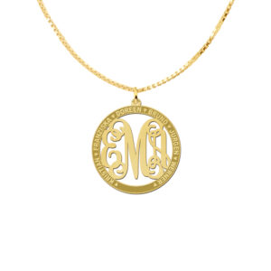 Deze monogram hanger met namen heeft een diameter van 33 mm en is gemaakt van 14-karaats goud, waardoor het een opvallend, kwalitatief sieraad is. U kunt bij deze monogram hanger met namen maar liefst zes namen en drie monogram letters aangeven die dan in het sieraad verwerkt worden voor een werkelijk persoonlijk cadeau.