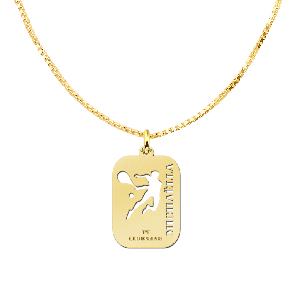 Deze tennis sporthanger heeft een formaat van 16×23 mm en is gemaakt van 14-karaats goud. De hanger bestaat uit een glad gouden plaatje met een uitgespaarde tennisser met racket en tennisbal. Rechts op het plaatje is er ruimte voor één door u opgegeven uitgespaarde naam en onderaan is er plaats voor één door u opgegeven uitgespaarde datum.