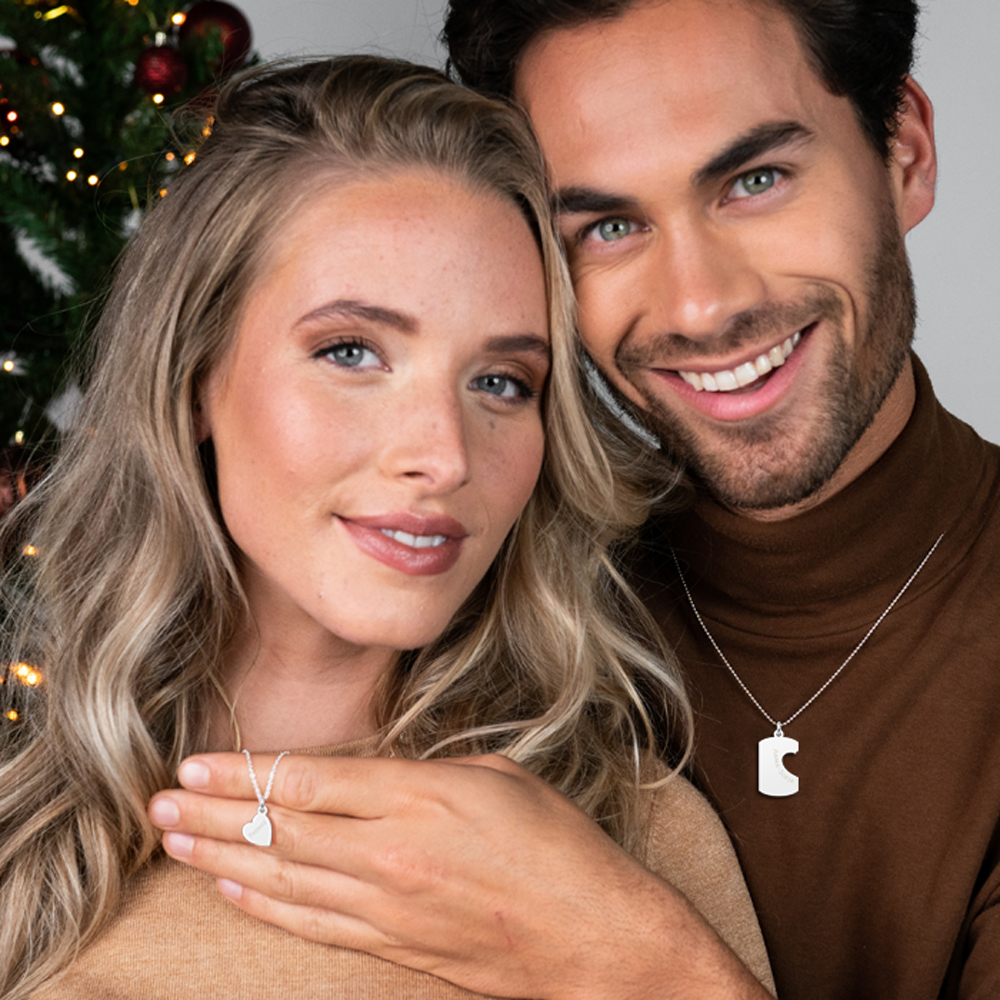 - Bij deze tweedelige vriendschapshanger dient u twee namen door te geven van maximaal 10 tekens per stuk. Geef duidelijk door welke naam u op welke hanger geplaatst wenst te hebben.