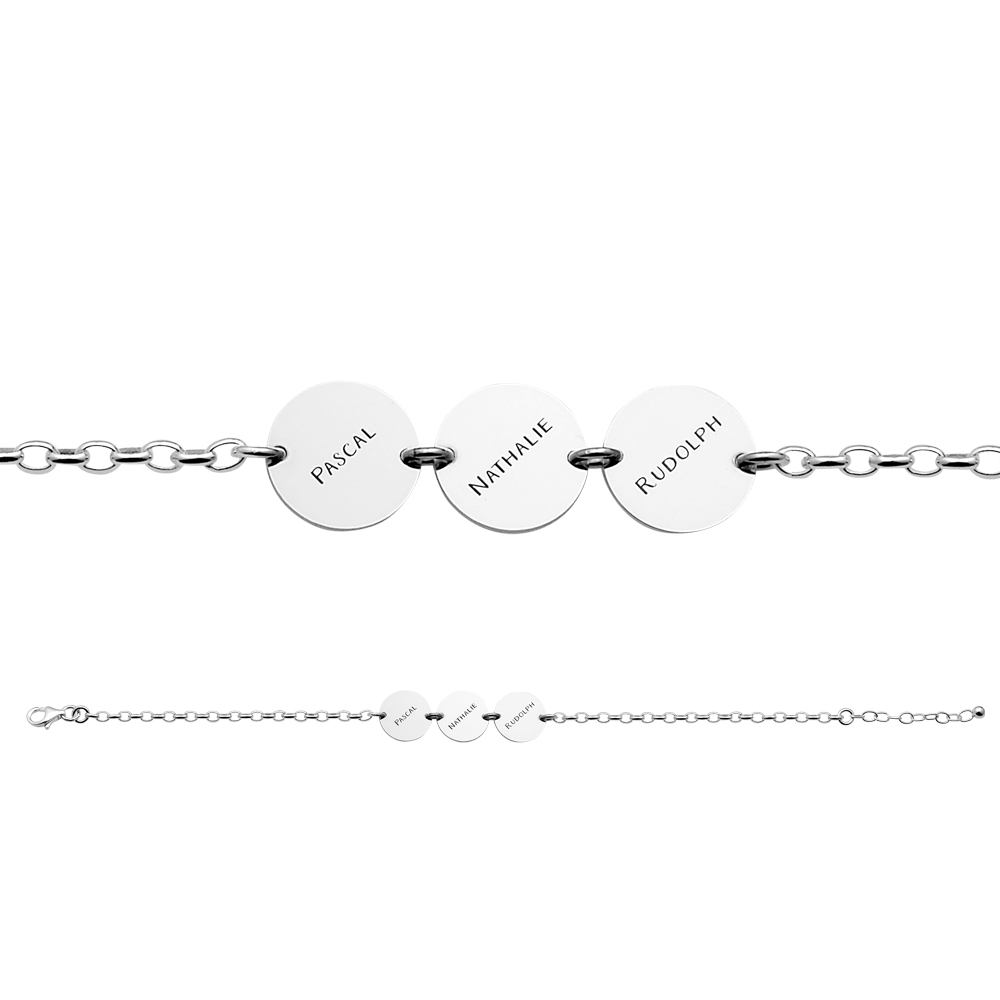 Deze zilveren armband met drie rondjes van Names4ever is gemaakt van 925 sterling zilver, de allerbeste kwaliteit zilver, en bestaat uit meerdere slanke schakels die mooi op elkaar aansluiten, met aan de voorkant drie ovaaltjes. Deze drie rondjes kunnen voorzien worden van drie namen naar keuze, die diagonaal over het plaatje geplaatst worden, zodat u verzekerd bent van een persoonlijk en uniek sieraad. Aan de achterkant zit een handige karabijnsluiting, waardoor u deze armband gemakkelijk om- en afdoet. Deze armband heeft een maximale lengte van 20cm met een minimale draaglengte van 17cm. De hartvormige plaatjes hebben een afmeting van 12x12mm met een dikte van 0,7mm.