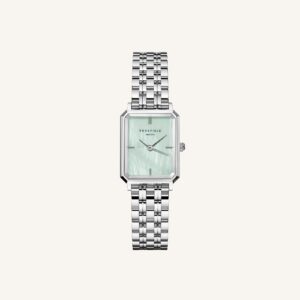 De Rosefield Octagon XS is een dames horloge met een stijlvolle messing kast en een groene parelmoer wijzerplaat. Dit horloge heeft een zilverkleurige roestvrijstalen band, die zorgt voor een moderne en comfortabele uitstraling. De horlogekast heeft een afmeting van 19.5 x 24 mm en een dikte van 7 mm. Het analoge display biedt een heldere en eenvoudige tijdsweergave. Dit Rosefield horloge uit de Octagon XS collectie is een elegante keuze voor elke gelegenheid, van dagelijks gebruik tot formele evenementen.