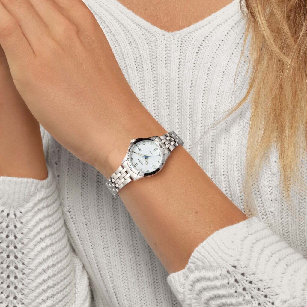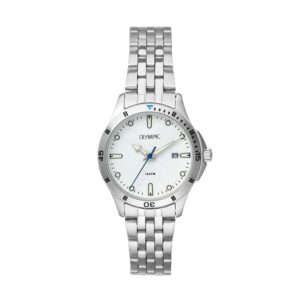 Dit unieke Olympic horloge met artikelnummer: OL72DSS112 is een dameshorloge met een classic sportieve uitstraling. Het horloge heeft een ronde stalen kast met een witte wijzerplaat met een datum, witte strepen en stippen ingelegd met lumibrite. Aan de kast zit een stalen schakelband met vouwsluiting. Het horloge heeft een mineraalglas, een doorsnee van 28mm en is 10ATM.